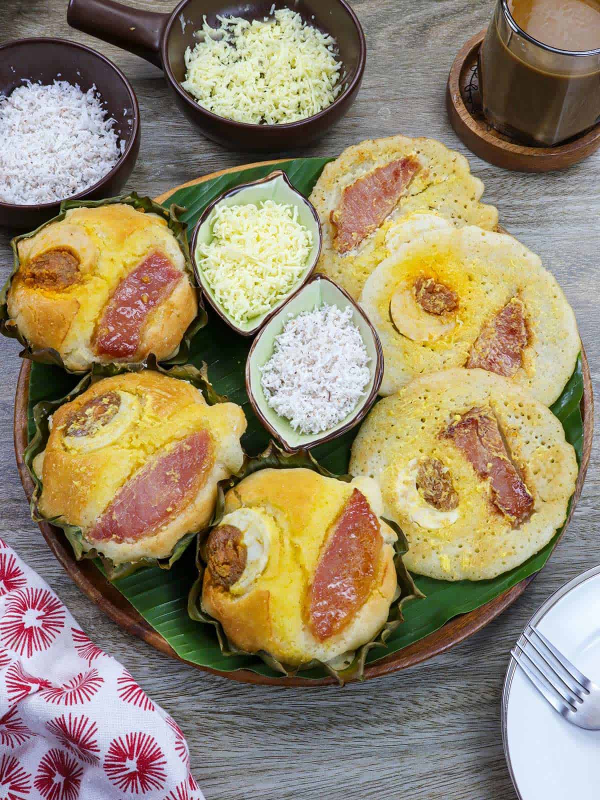 While pancakes are delicious, topping them with slices of salted eggs and ham takes them to the next level. Ham may not be a traditional addition, but its sweet-savory flavors add another layer of yum to these Filipino rice cakes.