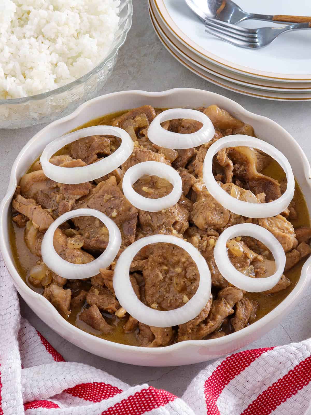 - Creamy Pork steak, like the classic Filipino beef Steak, is a great main dish for lunch or dinner. It is best enjoyed with hot steamed rice. Before serving, garnish the dish with fresh onion rings.