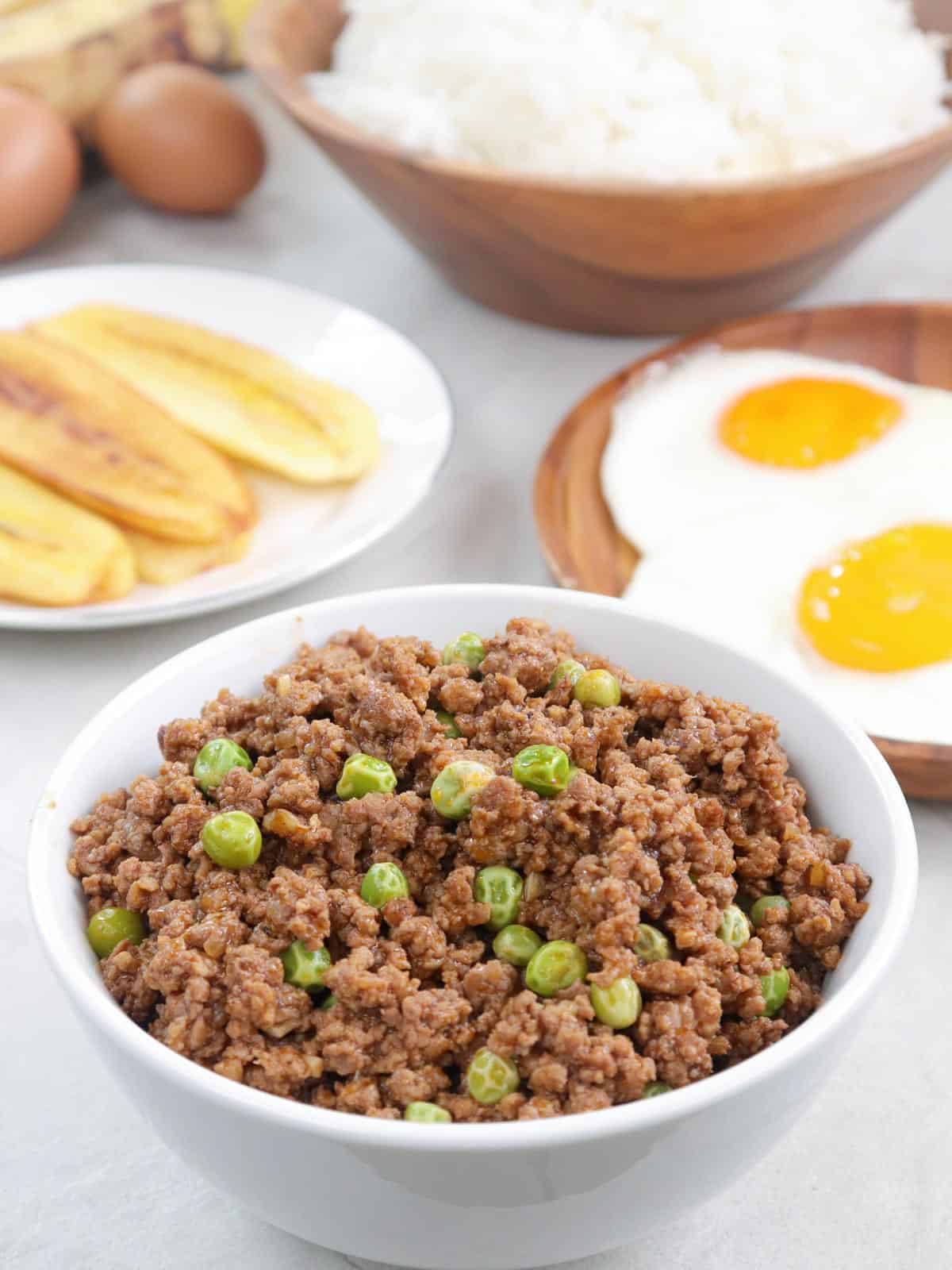 - Serve the minced beef with steamed rice, fried bananas, and fried eggs.