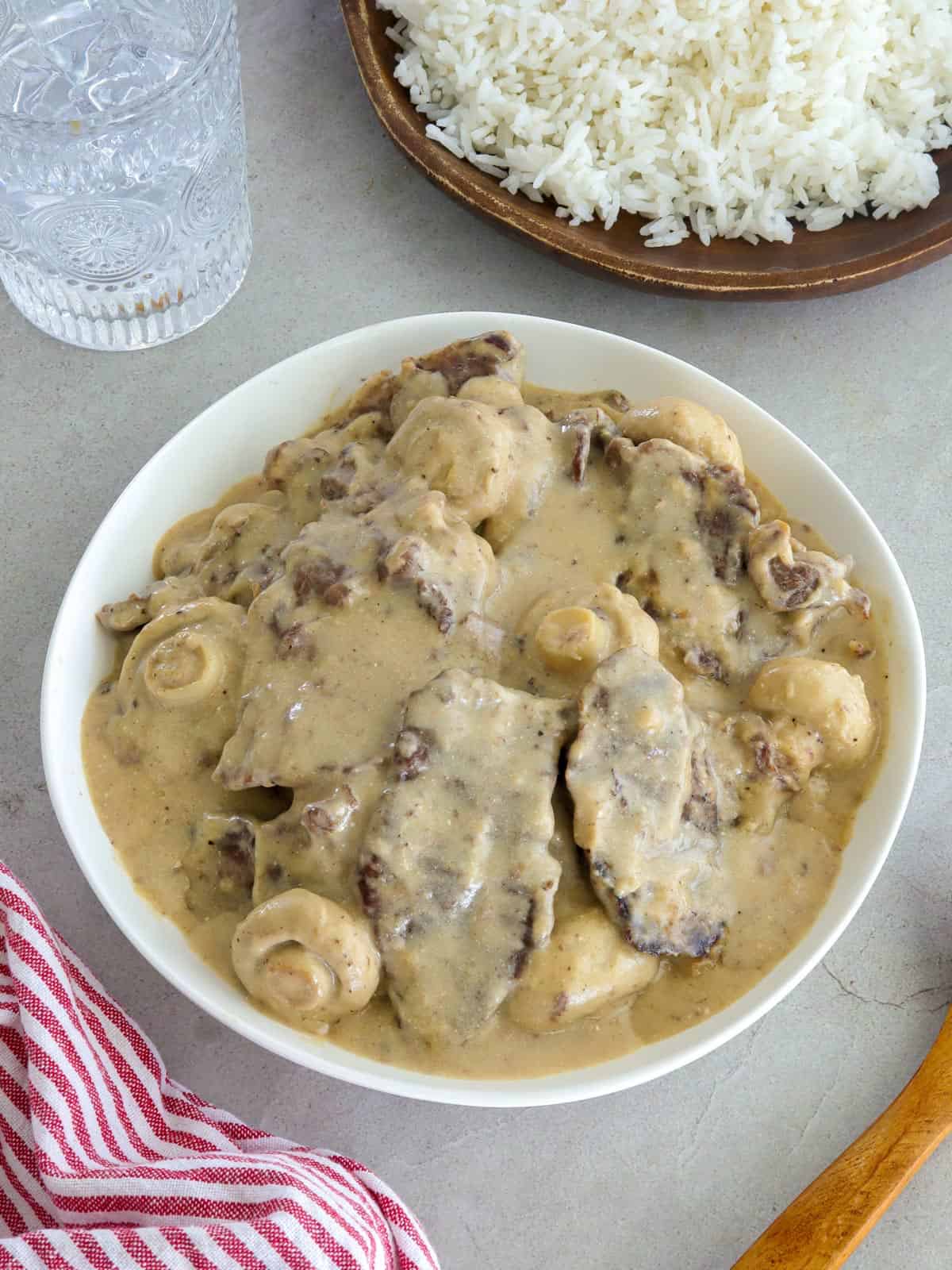 Make dinner extra delicious with fork-tender beef and delectable mushroom gravy served over steamed rice, mashed potatoes, or egg noodles! This Beef in Creamy Mushroom Sauce is easy to make and cooks in one pan!