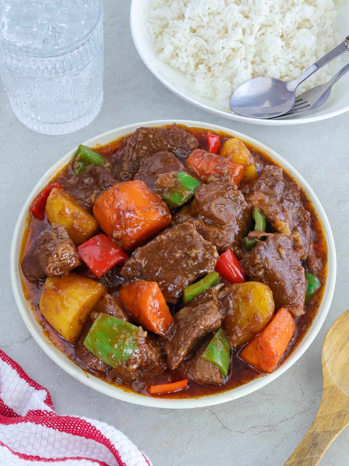 However, it has been adapted to suit local tastes. Calamansi juice and soy sauce, along with aromatics such as garlic, onions, and bay leaves, are key ingredients in the braising liquid, which provides a depth of flavor. Chunks of carrots, potatoes, and bell peppers complete the dish with added color and texture.