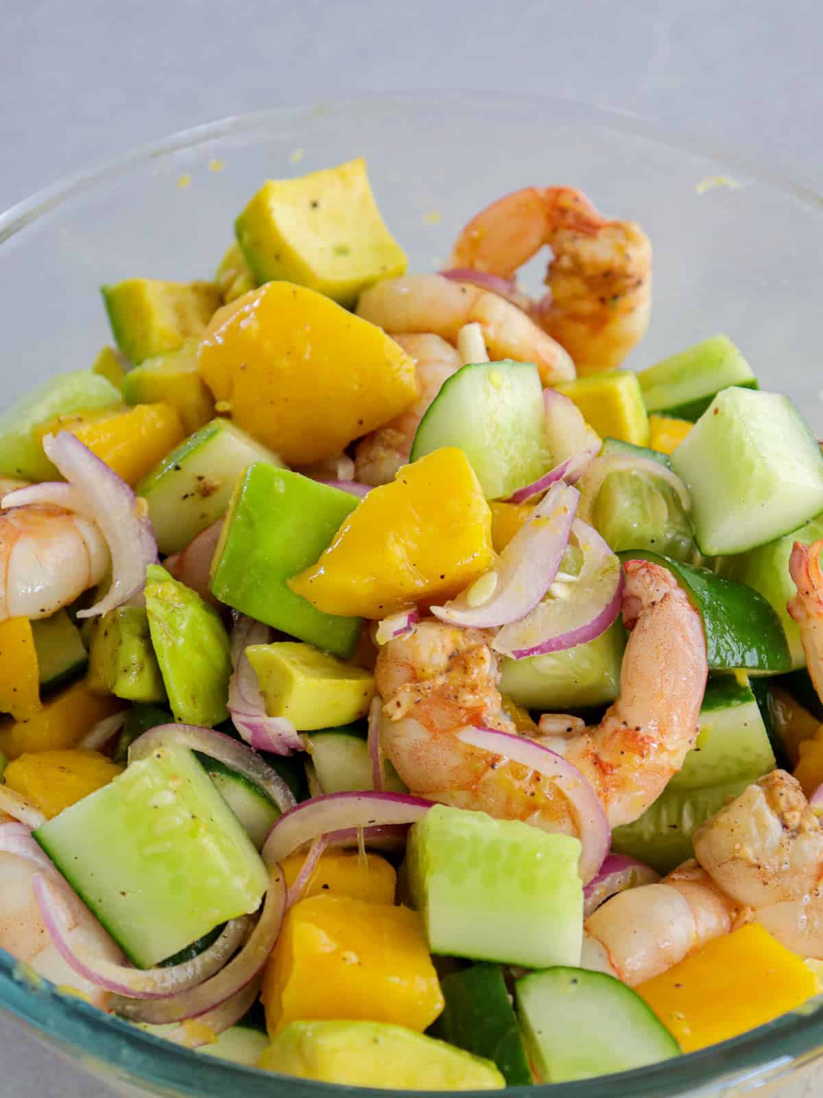 - In a large bowl, combine grilled shrimp, mangoes, avocados, cucumbers, and red onions.