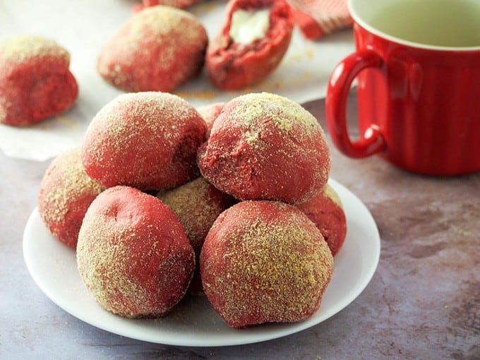 This recipe is based on Kawaling Pinoy's delicious pandesal, which I modified to include cocoa powder, red food coloring, and delicious cream cheese filling. The result is a pillowy soft bun that is as pretty as it is tasty!