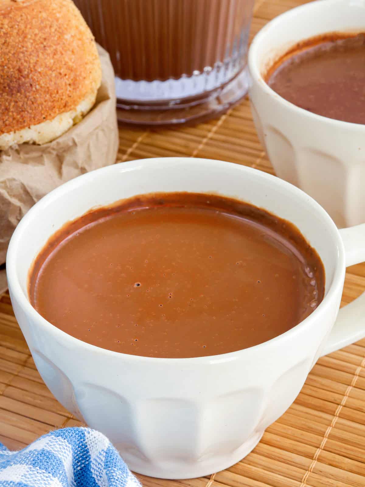 - Whisk- Remove from heat and twirl the batidor in the chocolate mixture until frothy. If using a mechanical frother, insert the frother whisk into the serving pot, holding it at a slight angle. Turn it on and move it up and down until the drink is frothy. Pour into individual mugs and serve immediately.