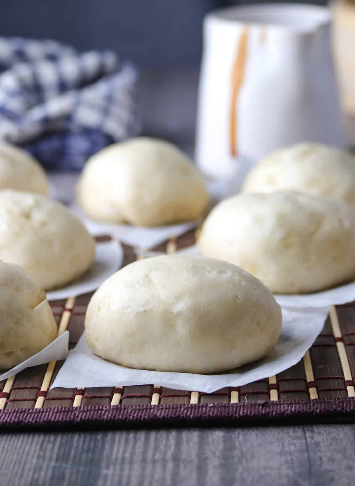 - Place each dough balls seam side down on 3 x 3-inch cut parchment paper and arrange in a single layer on a steamer basket at about 1 to 2 inches apart.