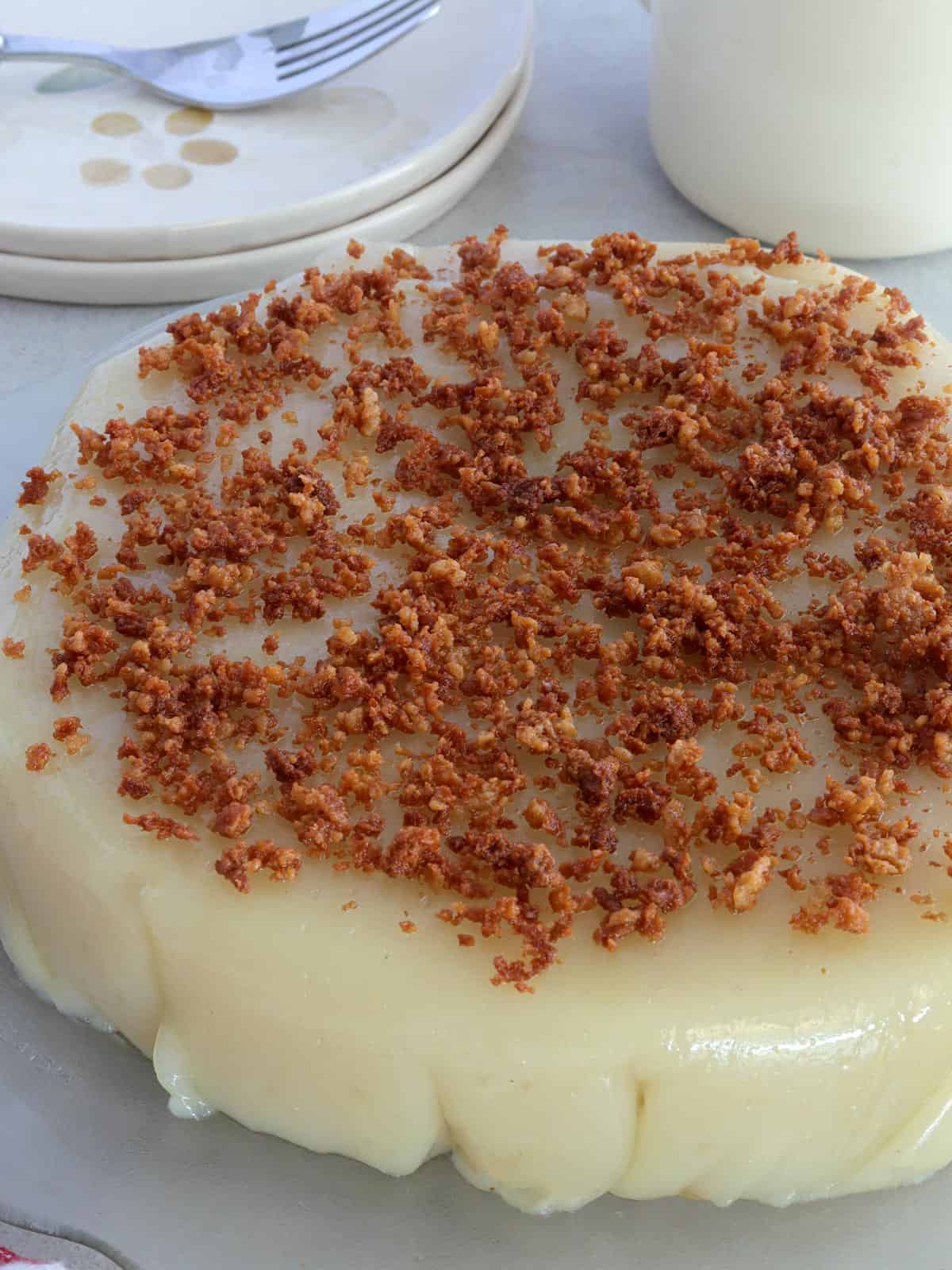 - Remove from steamer and allow to cool completely. Invert the cake onto a serving platter and peel off the banana leaves.