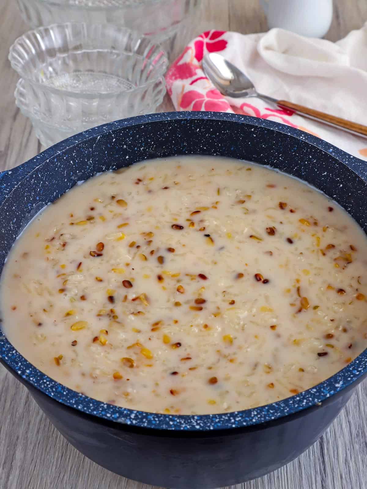 - The rice pudding will thicken as it stands and cools so you might want to cook it a little thinner than you like.