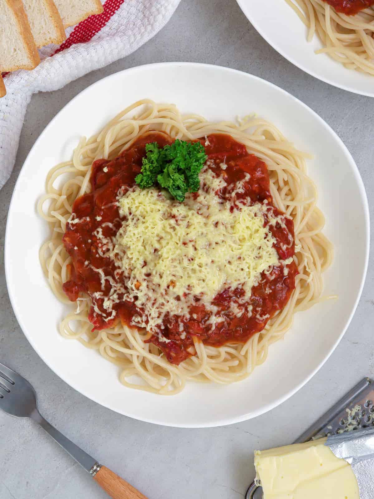 - To serve, transfer spaghetti onto a serving platter, spoon sauce over pasta, and sprinkle cheese on top. Serve hot.