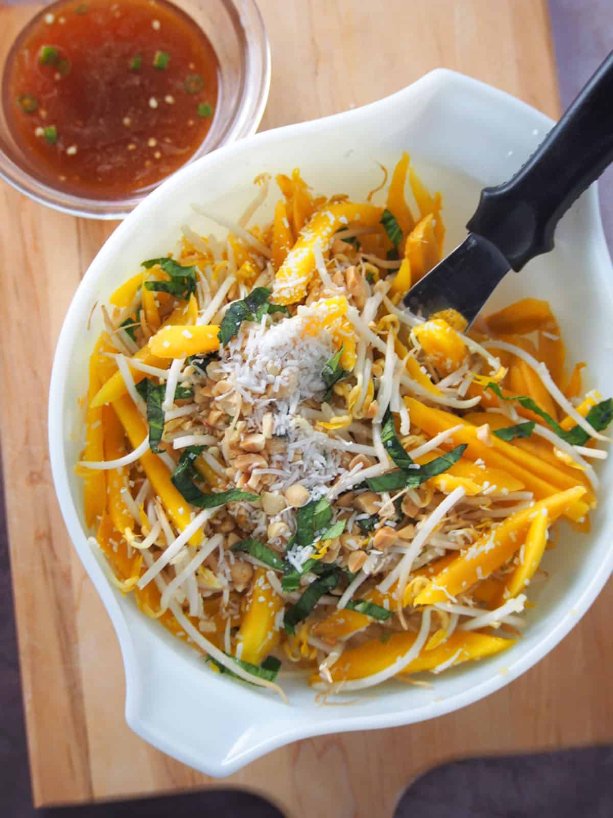 - Store the mangoes and dressing in separate containers. Skip the bean sprouts, peanuts, and toasted coconut, and add them when ready to serve, as they tend to lose their texture over time.