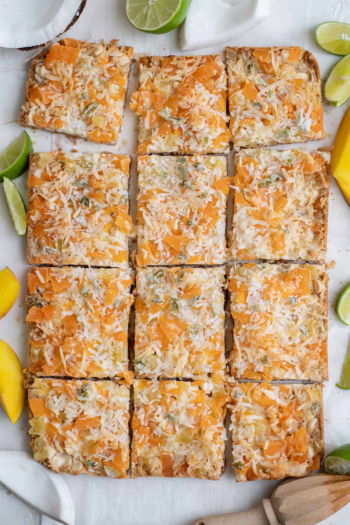 - Sprinkle the white chocolate chips, dried pineapple, dried mango, shaved coconut, and candied lime over the crust.