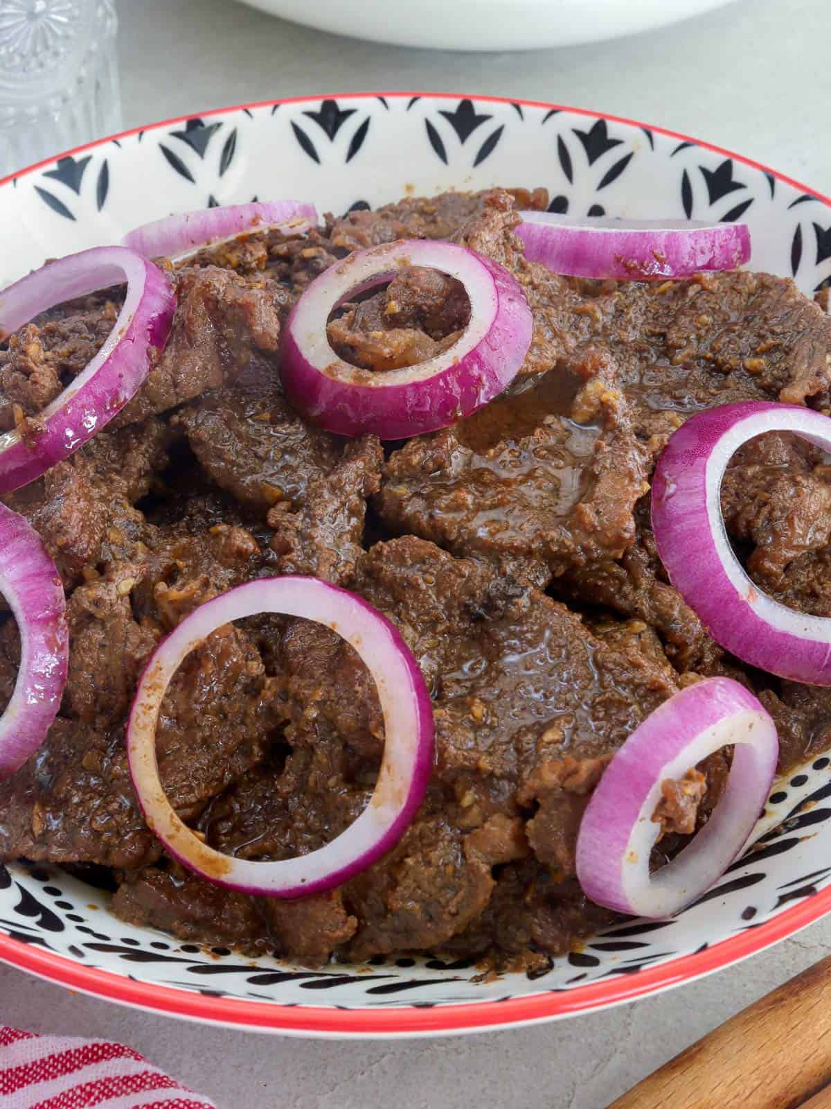 - Squeeze the onions and garlic of the marinade and use to braise the beef. Use a fresh piece of onion as the garnish.