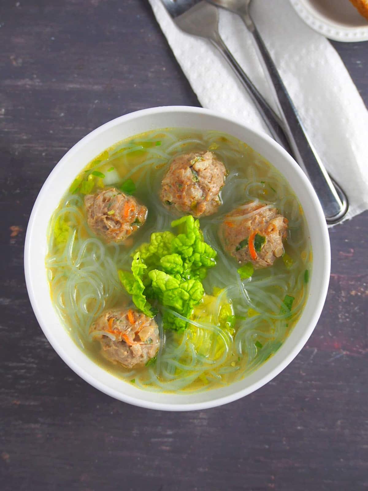 Sotanghon at bola-bola soup is made of juicy meatballs, cellophane noodles, cabbage, and celery for a hearty and filling main or side dish. This Filipino-style noodle soup is a delicious way to warm up in cold weather and is sure to be a family favorite.