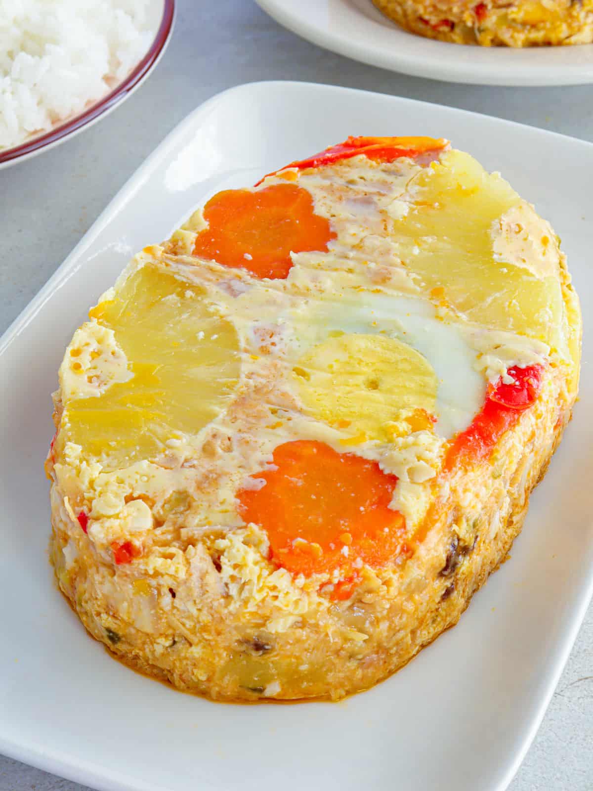 This steamed meat loaf has a unique yet nonetheless delicious myriad of flavors. A festive mix of diced pork, luncheon meat, ketchup, sweet pickles, bell peppers, cheese, raisins, and pineapple tidbits, it's the perfect balance of savory and sweet that will have your guests coming back for more!