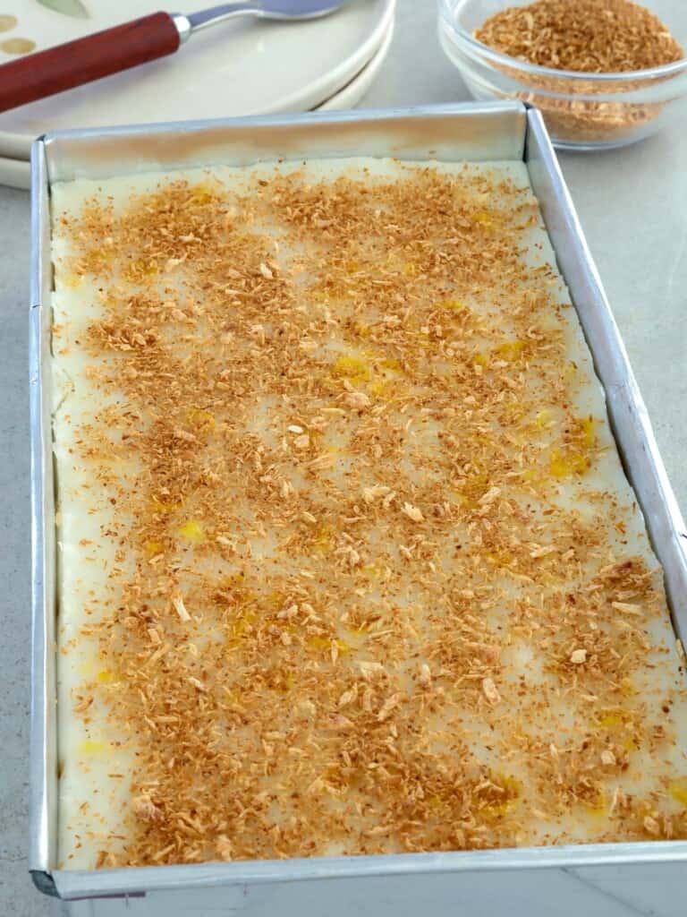 - Top with a smattering of latik or shredded coconut for added aroma, flavor, and crunch, and slice into serving portions.