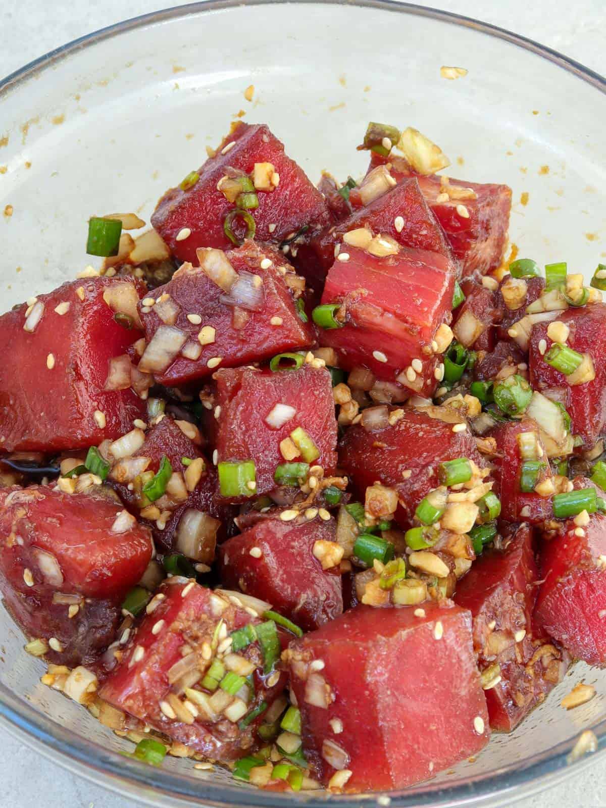 - 1 pound sushi-grade ahi (tuna) steaks, cut into 1-inch cubes