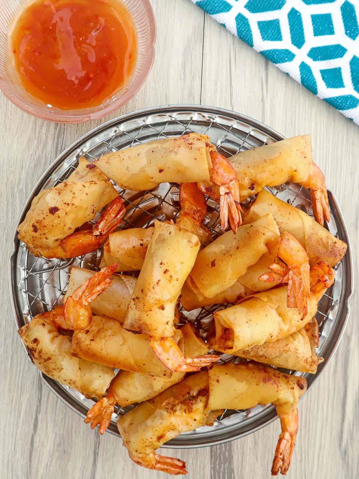 - Loosely cover the stuffed shrimp wrapped in a paper towel until ready to fry to prevent the spring roll wrapper from drying.