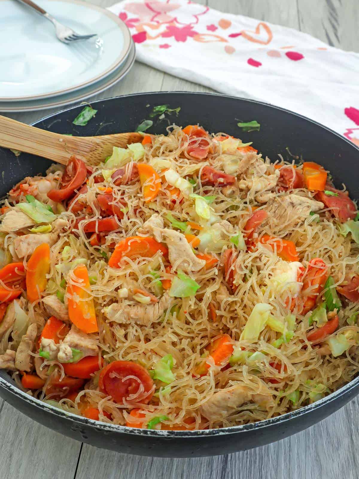 Pancit Bihon Guisado with rice noodles, meat, shrimp, and vegetables is sure to be a family favorite. Perfect for everyday meals and special occasions!